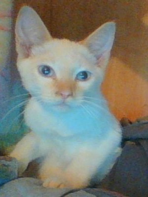 After a few weeks we brought the mother and kittens in under our porch with food, water, a litter box,and a cage for them. I started bringing Marshmellow into my room and holding him a lot for about an hour or two. He was getting some orange on him and I thought "he looks like a Siamese", so I looked it up and found this site and sure enough he is a flame point.