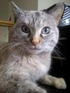 The clinic staff 'accidentally' led him past the boarding cages where he noticed her and said "what a pretty cat!" That was Taffy, a 12-year-old torbie-point Siamese mix that they were boarding for a local foster rescue group.