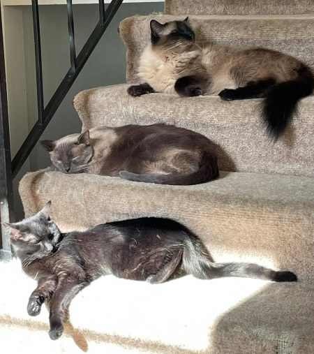 Mira lives with two Siamese cats - young Lando Catrissian, seen here enjoying his position at the 'top of the heap', and older boy Han Solo, who's taking a well-earned snooze in the photo. Mira, at the bottom, has found the brightest, warmest sun puddle on the stairs!